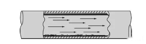 之所以這樣做,是因為吸氣管中主要是已蒸發的制冷劑,但是也有少許制冷劑液體和油。下圖顯出制冷劑蒸氣和一些液珠流過較大管徑的吸氣管。由于管徑較大,制冷劑蒸氣的流速常常很低,制冷劑液珠和油沉積在管線底部。