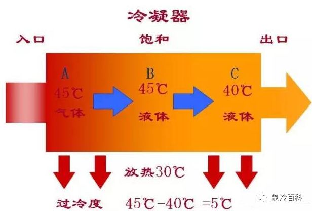 以R22冷媒為例,假設(shè)冷凝器內(nèi)的壓力為1.64MPa,則飽和溫度為45℃。飽和狀態(tài)的A-B間為45℃,A-B間冷媒為氣液混合狀態(tài)(潛熱)。B-C間所有的氣體已經(jīng)變?yōu)橐后w,狀態(tài)為全液體狀態(tài),并且不斷向周?chē)幔箿囟壤^續(xù)下降[本文來(lái)源:制冷百科公眾號(hào)],譬如降至40℃ 。這時(shí)冷凝器出口溫度比冷凝器內(nèi)的溫度低5℃,這種狀態(tài)稱(chēng)為過(guò)冷,我們稱(chēng)這時(shí)流出的冷媒有5℃的過(guò)冷度(過(guò)冷度=45-40=5℃)。
