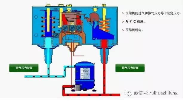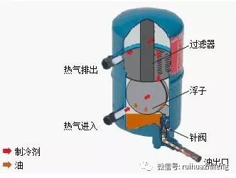 現(xiàn)在,我們將上述簡(jiǎn)單系統(tǒng)中的部件換成實(shí)際部件:一臺(tái)壓縮機(jī)、一個(gè)冷凝器、一個(gè)毛管 和 一個(gè)蒸發(fā)器。 如下圖,這就接近于真實(shí)的制冷系統(tǒng)了。2、制冷系統(tǒng)—膨脹閥熱力膨脹閥能控制液態(tài)制冷劑從冷凝器注入蒸發(fā)器。膨脹閥能讓蒸發(fā)器出口處的過(guò)熱度保持在一定水平, 防止液態(tài)制冷劑離開(kāi)蒸發(fā)器進(jìn)入壓縮機(jī)。一旦液態(tài)制冷劑進(jìn)入壓縮機(jī),便會(huì)發(fā)生液擊。必須防止這種狀況 發(fā)生,以免壓縮機(jī)損壞。Pb-感溫包壓力Pe-蒸發(fā)壓力Ps-彈簧壓力Pb = Ps+Pe, 膜片不移動(dòng)。當(dāng)感溫包壓力上升,導(dǎo)致 Pb > Ps+Pe 時(shí),膜片向下移動(dòng),閥門打開(kāi),更多制冷劑流入蒸發(fā)器。當(dāng)感溫包壓力下降,導(dǎo)致 Pb < Ps+Pe 時(shí),膜片向上移動(dòng),閥門關(guān)閉,流入蒸發(fā)器的制冷劑減少。3、制冷系統(tǒng)—儲(chǔ)液器在高壓條件下,壓縮后的制冷劑蒸氣在冷凝器中凝結(jié)為液體制冷劑。離開(kāi)冷凝器后,液體流經(jīng)儲(chǔ)液器。儲(chǔ)液器主要有兩個(gè)功能。 1、儲(chǔ)液器對(duì)負(fù)荷變化造成的冷凝器液位變化進(jìn)行補(bǔ)償。當(dāng)膨脹閥打開(kāi)/關(guān)閉時(shí),冷凝器的液位會(huì)發(fā)生改變,若儲(chǔ)液器中沒(méi)有“額外”的制冷劑,膨脹閥前端的液體量就可能不足,致使膨脹閥無(wú)法正常工作,造成整個(gè)系統(tǒng)變得不穩(wěn)定。2、儲(chǔ)液器還作為一個(gè)額外的容器,幫助液態(tài)制冷劑與制冷劑蒸氣分離,確保離開(kāi)儲(chǔ)液器的是純液態(tài)制冷劑。4、制冷系統(tǒng)—電磁閥電磁閥是一種利用電磁力的閥門。它是一種開(kāi)/關(guān)閥,根據(jù)通斷電情況控制制冷劑的流動(dòng)。電磁閥大致可分為兩類。直動(dòng)式電磁閥 – 閥線圈通電時(shí),電磁閥直接打開(kāi)/關(guān)閉閥口。伺服式電磁閥 – 通電或斷電時(shí),閥門打開(kāi)引導(dǎo)閥口,讓主閥口根據(jù)膜片/活塞的壓差逐漸開(kāi)(取決于閥門是 NC 還是 NO)。這兩種電磁閥又各自分為:NC(常閉型)不通電時(shí)限制制冷劑流動(dòng)(平常關(guān)閉),閥線圈通電時(shí)允許制冷劑流動(dòng)。NO(常開(kāi)型)不通電時(shí)允許制冷劑流動(dòng)(平常打開(kāi)),閥線圈通電時(shí)限制制冷劑流動(dòng)。工作原理:冷藏室溫度上升時(shí),感溫包壓力上升到設(shè)定值,電源端子 1 和 4 接通,從而打開(kāi)電磁閥,允許制冷劑流入蒸發(fā)器。溫度下降時(shí), 感溫包內(nèi)的壓力下降到設(shè)定值。端子 1 和 4 斷開(kāi),子 1 和 2 接通。電磁閥斷電并關(guān)閉,因而限制制冷劑流向蒸發(fā)器,使冷藏室溫度上升。5、制冷系統(tǒng)—壓力控制器若電磁閥阻止制冷劑流向蒸發(fā)器,而壓縮機(jī)仍在運(yùn)轉(zhuǎn),這時(shí)會(huì)發(fā)生什么情況?進(jìn)氣壓力下降。為此我們需要停止壓縮機(jī),以便控 制系統(tǒng)壓力,防止進(jìn)氣壓力降到標(biāo)定壓力之下。此外,若由于冷凝器太臟或風(fēng)扇故障導(dǎo)致冷凝壓力升得過(guò)高,也必須停止壓縮機(jī), 以防壓縮機(jī)超出工作范圍。壓力控制器能防止進(jìn)氣壓力(蒸發(fā)器壓力)過(guò)低或排氣壓力(冷 凝器壓力)過(guò)高,以此控制和保護(hù)系統(tǒng)。壓力控制器主要有兩個(gè)功能:保護(hù)(或安全)功能: 限制壓力,系統(tǒng)壓力過(guò)低或過(guò)高時(shí)切 斷電源。控制功能 壓縮機(jī)循環(huán)、風(fēng)扇循環(huán)和排空。常見(jiàn)的壓力控制器有兩種:單壓控制器: 分為低壓控制器和高壓控制器。雙壓控制器:一個(gè)控制器兼具低壓控制和高壓控制。壓縮機(jī)高低壓保護(hù):壓縮機(jī)常常需要保護(hù),以防止冷凝壓力過(guò)高或者進(jìn)氣壓力過(guò)低。實(shí)現(xiàn)的方法是使用兩個(gè)單壓開(kāi)關(guān)或者一個(gè)雙壓開(kāi)關(guān)。開(kāi)關(guān)有多種 電氣接觸類型。這里看到的是一個(gè)簡(jiǎn)單的類型。高壓和低壓開(kāi)關(guān)組合在一個(gè)殼體內(nèi)。兩個(gè)球體作用于兩者之間的裝置。若壓力達(dá) 到“高”設(shè)定值,開(kāi)關(guān)將打開(kāi)觸點(diǎn)A 和 C。若壓力落到“低”設(shè)定值以下,開(kāi)關(guān)也會(huì)打開(kāi)觸點(diǎn) A 和 C。6、制冷系統(tǒng)—油分離器壓縮機(jī)排放的制冷劑熱氣將帶走壓縮機(jī)內(nèi)的油。有時(shí)候量太大,帶走的油不再回到壓縮機(jī)。為了防止這種狀況,我們用油分離器將制冷劑中的油分離出來(lái),使之回到壓縮機(jī)。油分離器的作用: 1、油分離器的作用是將熱氣中的油分離出來(lái),并通過(guò)自帶的控制 裝置讓油回到壓縮機(jī)的集油槽。2、油分離器可防止油量不足,對(duì)壓縮機(jī)具有保護(hù)作用。3、油分離器可防止油積聚在礙事之處并降低效率,因而對(duì)制冷系 統(tǒng)具有保護(hù)作用。油分離器的功能:1、 把油從排放的制冷劑氣體中分離出來(lái)。2、過(guò)濾器可防止油逸入制冷系統(tǒng)。3、 將油收集到分離器底部。 4、油位升高時(shí),浮子打開(kāi)一個(gè)針閥,讓油回到壓縮機(jī)集油槽。5、油位下降時(shí),浮子向下移動(dòng)并關(guān)閉針閥。7、制冷系統(tǒng)—干燥過(guò)濾器作用:制冷系統(tǒng)內(nèi)